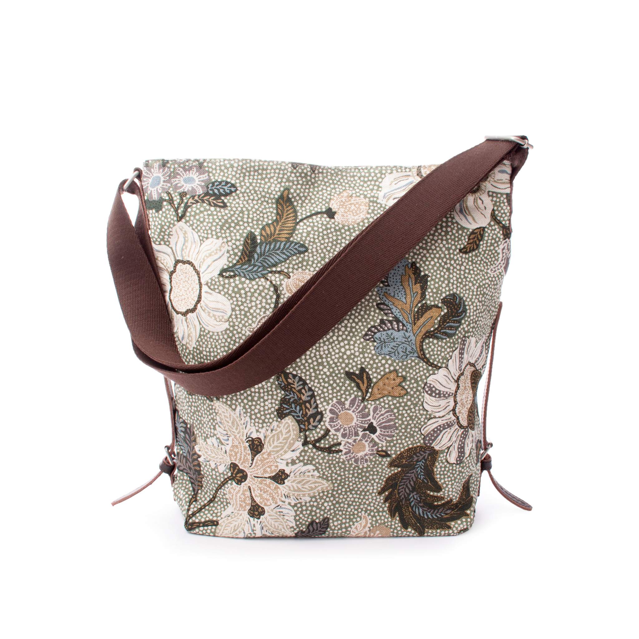 The bag is made of cotton linen and comes with leather trimming. It has adjustable shoulder straps and closes with a zipper and push button. The spacious compartment provides space for A4 format.