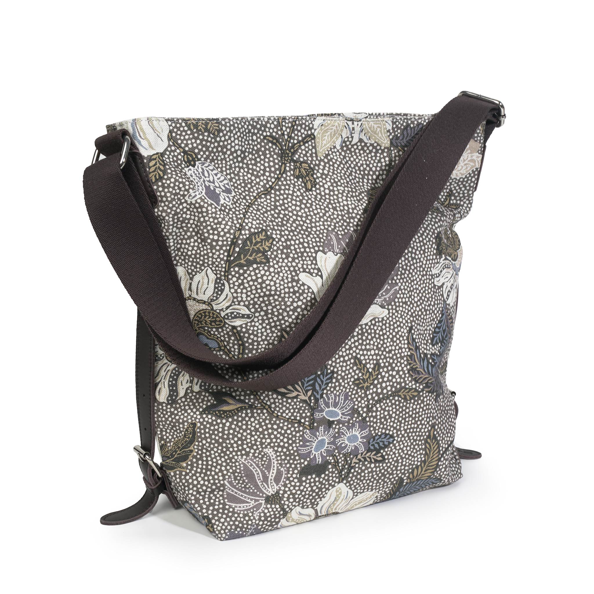 The bag is made of cotton linen and comes with leather trimming. It has adjustable shoulder straps and closes with a zipper and push button. The spacious compartment provides space for A4 format.